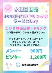 4月より水曜日限定で、100球当日券にドリンク券がついた